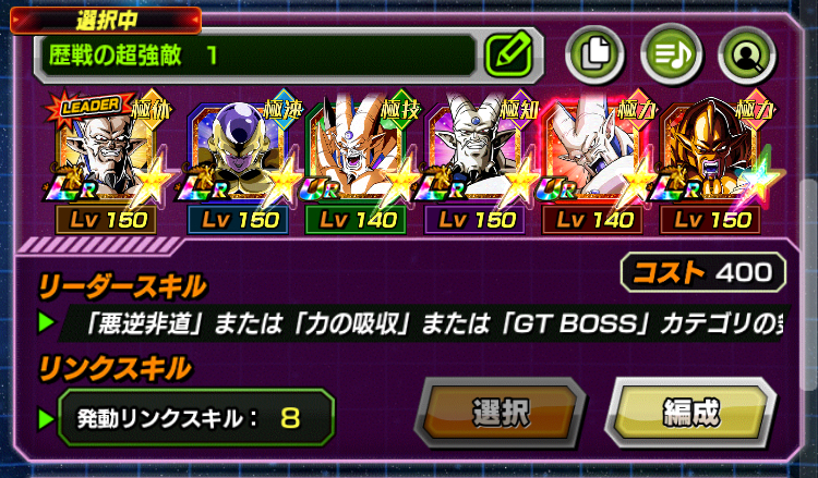 リーダーは、「悪逆非道」または 「GT BOSS」カテゴリの 気力+3、HP200%UPのリーダースキルを保持した【邪悪な力に覆われた世界】超一星龍としました。