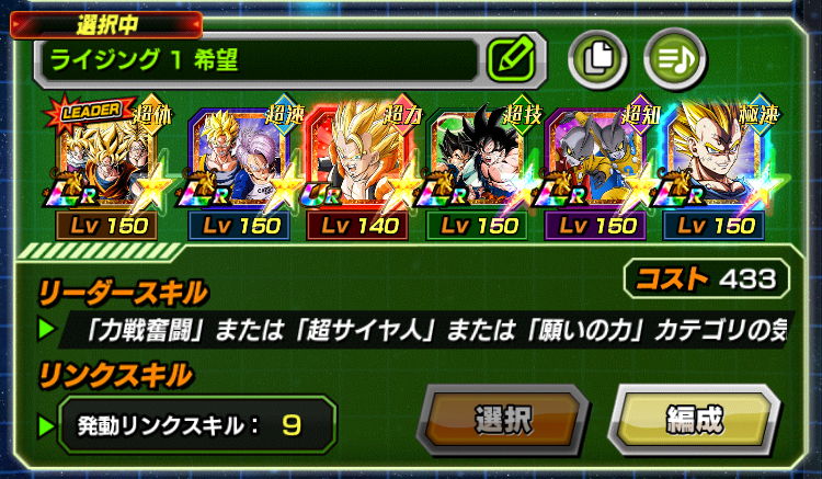 リーダーは、「力戦奮闘」カテゴリの 気力+3、HPとATKとDEF170%UPのリーダースキルを保持した【燃えるパワーの超激戦】超サイヤ人孫悟空&超サイヤ人孫悟飯(少年期) &超サイヤ人トランクス(青年期)としました。