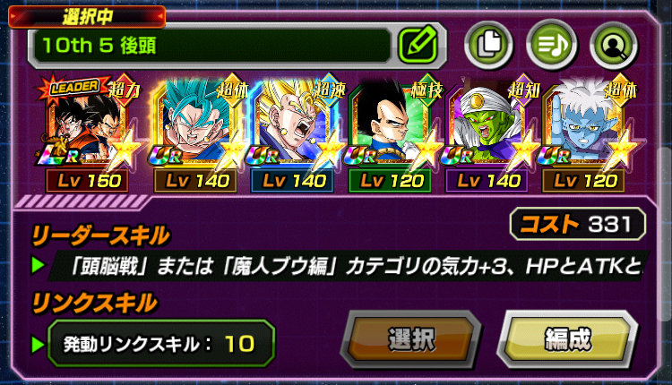 リーダーは「頭脳戦」カテゴリの 気力+3、HPとATKとDEF180%UPのリーダースキルを保持した【ひとつに重なった希望】孫悟空&ベジータ(天使)としました。