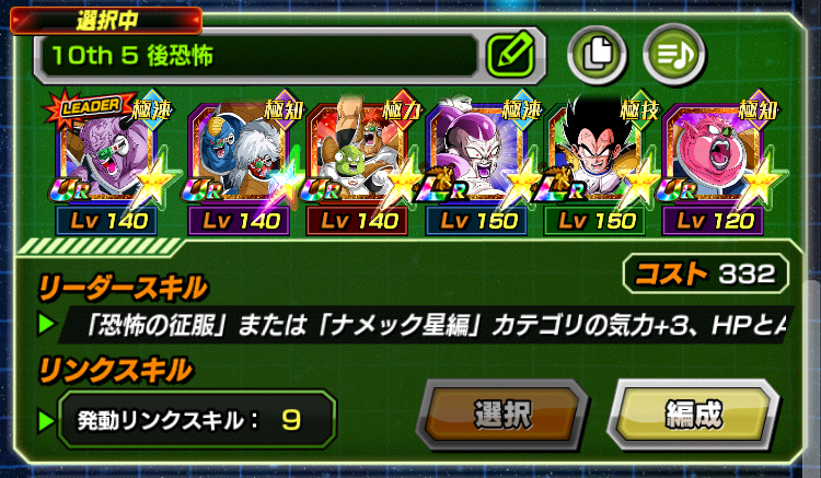 リーダーは、「恐怖の征服」カテゴリの気力+3、HPとATKとDEF170%UP、 「宇宙をわたる戦士」カテゴリを含む場合は 更に気力+1、HPとATKとDEF30%UPのリーダースキルを保持した【隊長のとっておき】ギニューとしました。