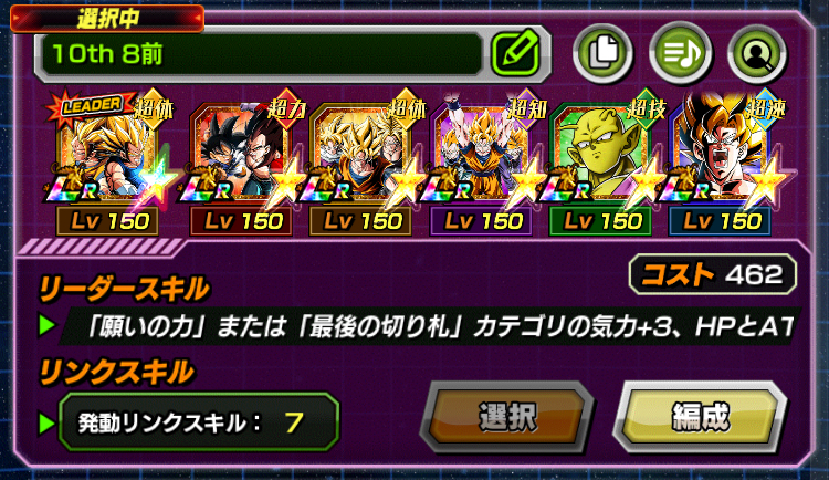 リーダーは、「願いの力」カテゴリの気力+3、HPとATKとDEF170%UP、 「つながる希望」カテゴリを 含む場合は更にHPとATKとDEF30%UPのリーダースキルを保持した【全宇宙最後の希望】超サイヤ人3孫悟空&超サイヤ人2ベジータとしました。