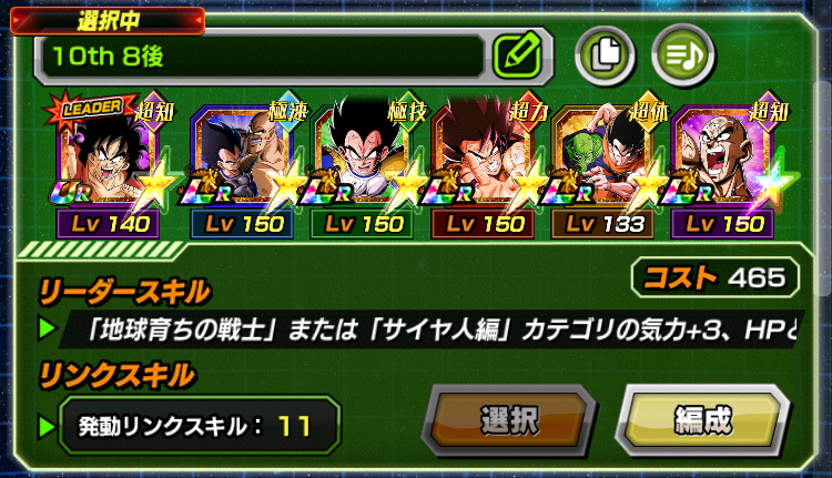 リーダーは、「サイヤ人編」 カテゴリの気力+3、HPとATKとDEF170%UP、 「地球人」または「亀仙流」カテゴリを 含む場合は更に気力+1、HPとATKとDEF30%UPのリーダースキルを保持した【地球屈指の精鋭】ヤムチャとしました。