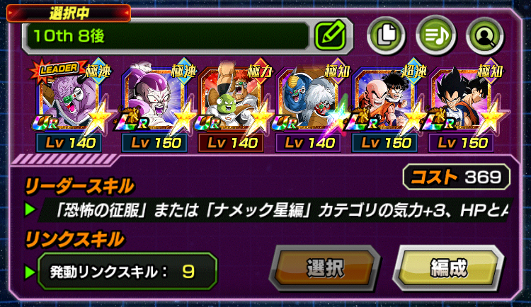 リーダーは、「ナメック星編」 カテゴリの気力+3、HPとATKとDEF170%UP、 「宇宙をわたる戦士」カテゴリを含む場合は 更に気力+1、HPとATKとDEF30%UPのリーダースキルを保持した【隊長のとっておき】ギニューとしました。