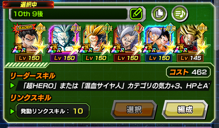 リーダーは、「混血サイヤ人」 カテゴリの気力+3、HPとATKとDEF170%UP、 「親子の絆」または「劇場版HERO」カテゴリを 含む場合は更にHPとATKとDEF30%UPのリーダースキルを保持した【覚醒するスーパーヒーロー】アルティメット孫悟飯としました。