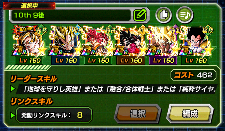 リーダーは、「地球を守りし英雄」または「融合/合体戦士」 または「純粋サイヤ人」カテゴリの 気力+3、HP200%UPのリーダースキルを保持した【天下無敵の閃光】超サイヤ人孫悟空+超サイヤ人ベジータ(天使)としました。