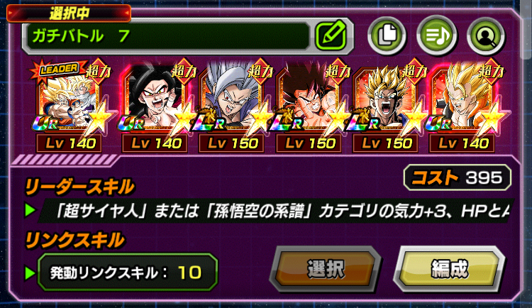 リーダーは、「超サイヤ人」または「孫悟空の系譜」 カテゴリの気力+3、HPとATKとDEF170%UPのリーダースキルを保持した【地球の運命を背負う戦士】超サイヤ人孫悟空/超サイヤ人孫悟飯(少年期)としました。