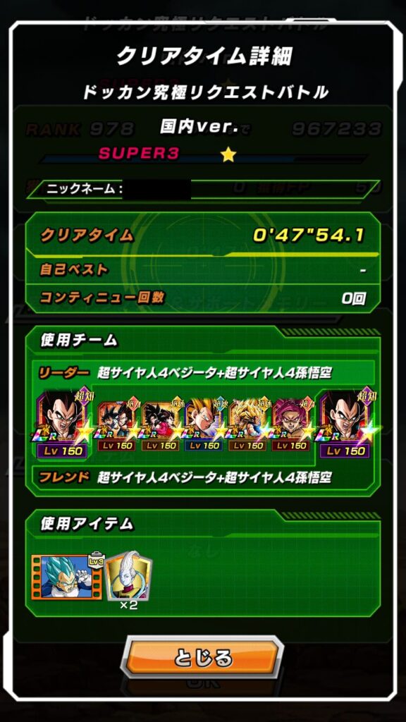7戦目までは、無限上昇効果持ちのキャラクターでなるべく必殺技を発動するように行動します。11周年超サイヤ人4ベジータ、超サイヤ人4コンビ、孫悟空(GT)&超サイヤ人4ベジータの順の優先順位で必殺技を発動しました。