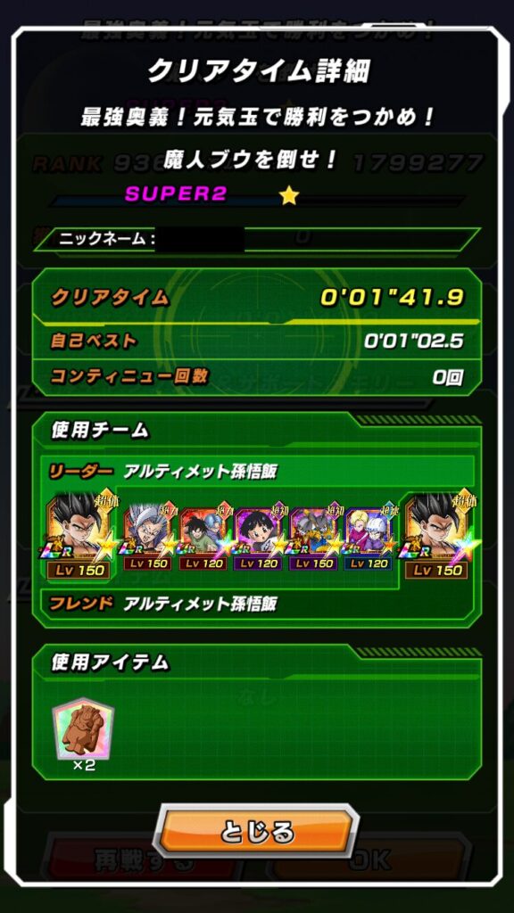 リーダーは、「超HERO」 カテゴリの気力+3、HPとATKとDEF170%UP、 「親子の絆」または「劇場版HERO」カテゴリを 含む場合は更に気力+1、HPとATKとDEF30%UPのリーダースキルを保持した【覚醒するスーパーヒーロー】アルティメット孫悟飯としました。自身の登場時、チームに自身の他に 「親子の絆」カテゴリの味方がいるとき 登場時演出が発動し、一度だけ、ATK 200%UPのパッシブスキルを保持しており、今回の編成のアタッカーも務めます。