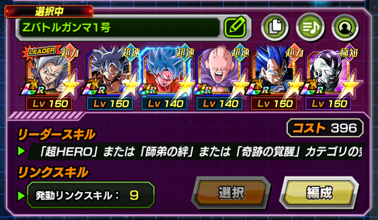 リーダーは、「超HERO」カテゴリの 気力+3、HPとATKとDEF170%UPのリーダースキルを保持した【究極を超えた新たな力】孫悟飯(ビースト)としました。