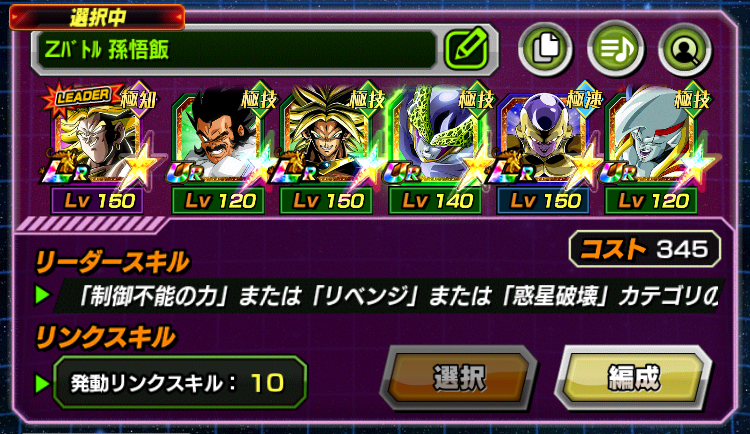 リーダーは、「リベンジ」カテゴリの 気力+3、HPとATKとDEF170%UP、 「劇場版BOSS」または「純粋サイヤ人」カテゴリを 含む場合は更にHPとATKとDEF30%UPのリーダースキルを保持した【全てを滅ぼす超戦士】伝説の超サイヤ人ブロリーとしました。