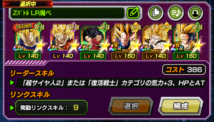 リーダーは、「超サイヤ人2」カテゴリの気力+3、HPとATKとDEF170%UPのリーダースキルを保持した【全てを吹き飛ばす闘志】超サイヤ人2ベジータとしました。