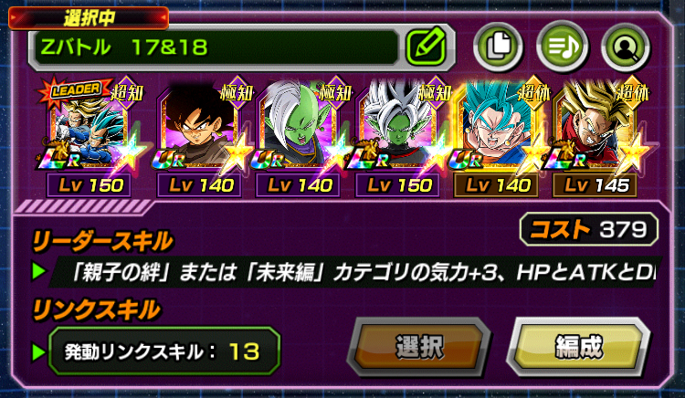 リーダーは、「未来編」 カテゴリの気力+3、HPとATKとDEF170%UPのリーダースキルを保持した【誇りと希望の力】超サイヤ人ゴッドSSベジータ &超サイヤ人トランクス(未来)としました。