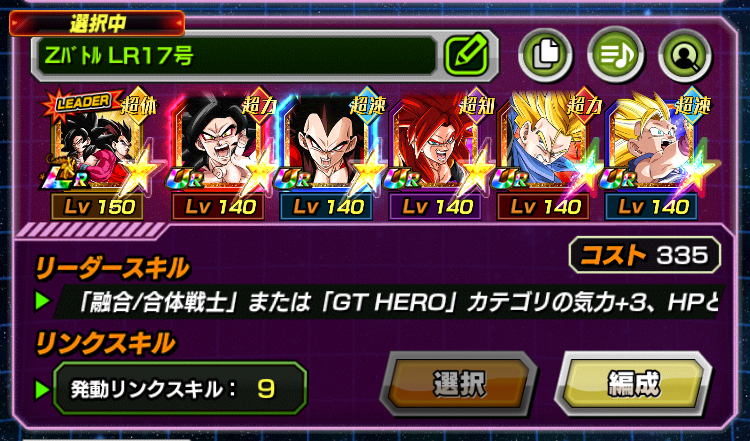リーダーは、「GT HERO」 カテゴリの気力+3、HPとATKとDEF170%UP、 「かめはめ波」カテゴリを含む場合は 更に気力+1、HPとATKとDEF30%UPのリーダースキルを保持した【究極パワーのサイヤ人戦士】超サイヤ人4孫悟空&超サイヤ人4ベジータとしました。