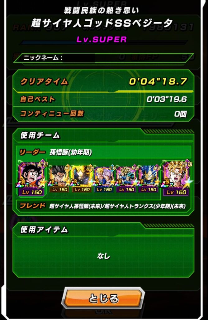 この記事は、『極限Zバトル 戦闘民族の熱き思い 超サイヤ人ゴッドSSベジータ』をオート周回で「未来編」カテゴリに属するキャラを3体以上編成しクリアミッションをクリアしたチームを紹介します。