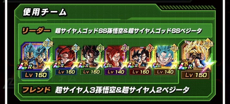 リーダーは、「命運をかけた闘い」カテゴリの 気力+3、HPとATKとDEF170%UPのリーダースキルを保持した【全身全霊をかけた決戦】超サイヤ人ゴッドSS孫悟空 &超サイヤ人ゴッドSSベジータとしました。
