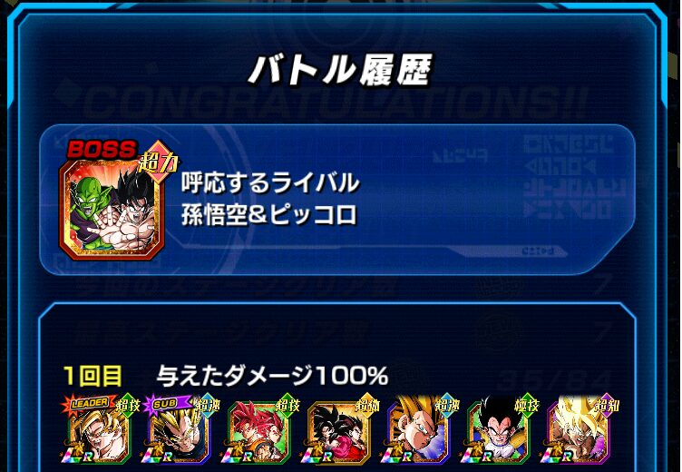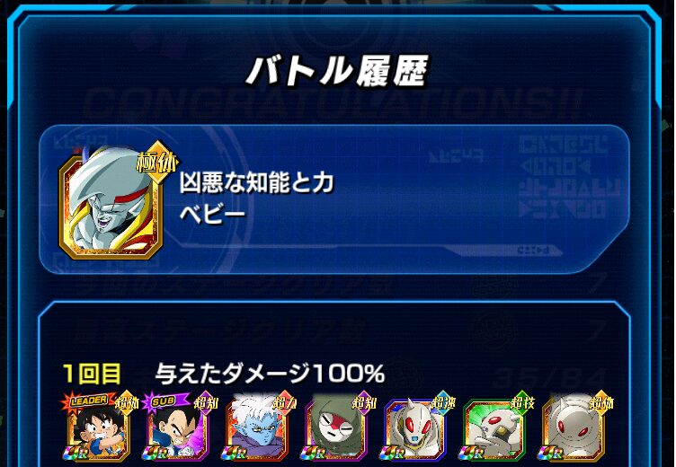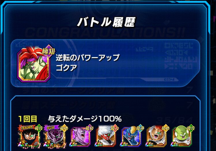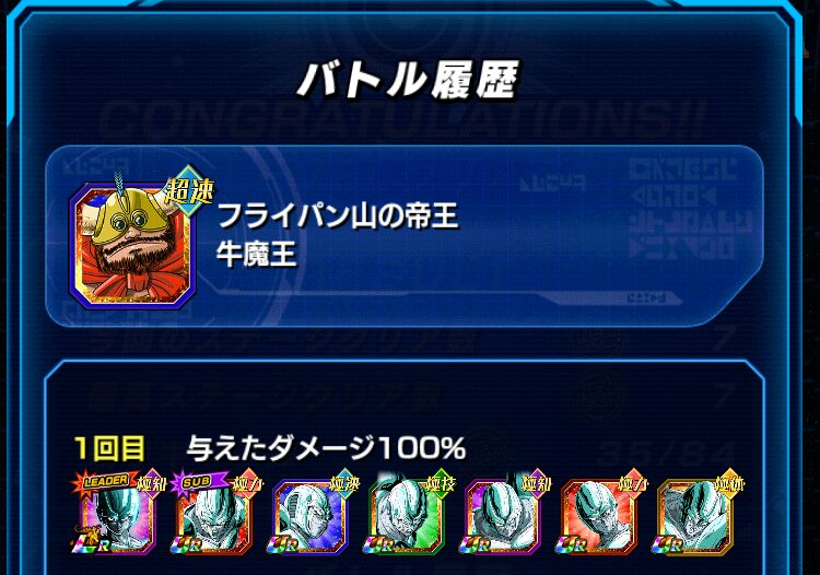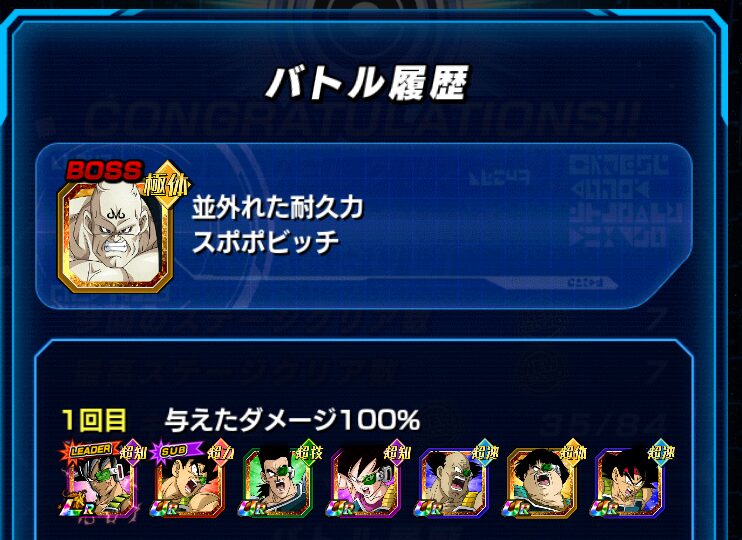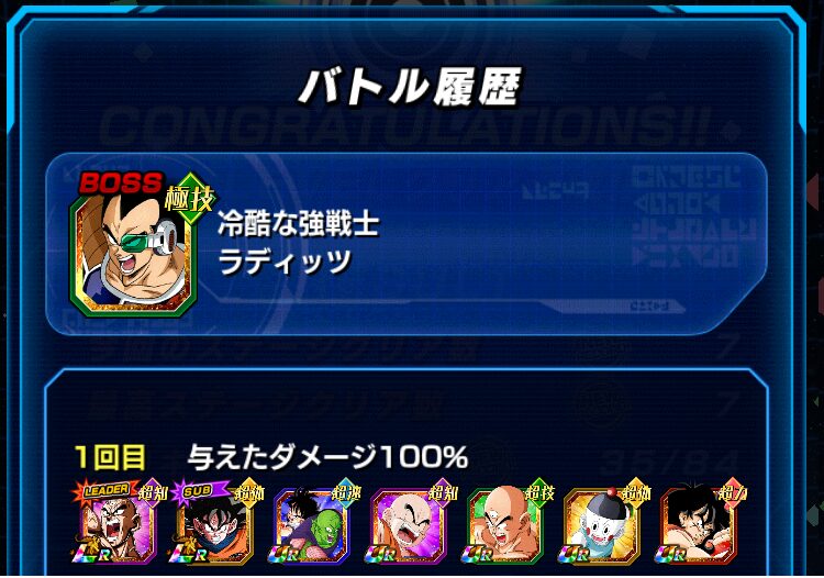イベント産のバーダックチームで挑みました。ダメージ軽減50%のパッシブスキルを保持した力属性のバーダック、若しくは、高確率で回避するパッシブスキルを保持したセリパを一番手に配置することで、クリアすることができます。