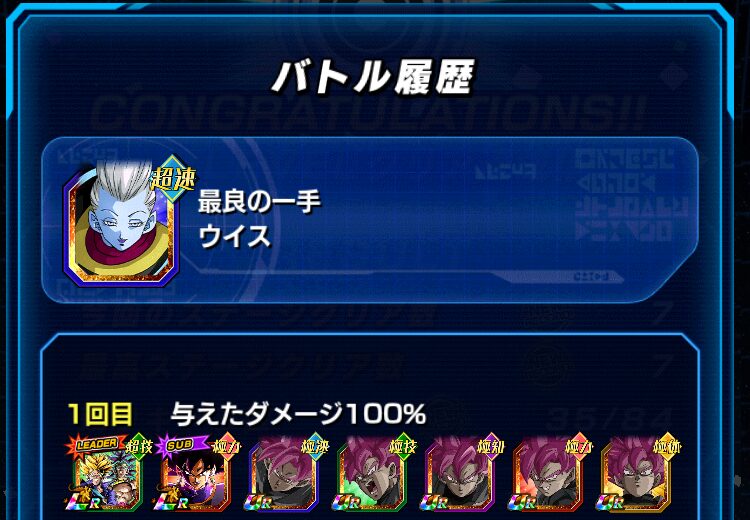 イベント産のゴクウブラックと、超サイヤ人トランクス&ブロリーのチームで挑みました。一番手は、最大回避率が90%になる速属性のゴクウブラックに任せます。速属性が一ターン目にいない場合、力属性のキャラクターに任せます。また、技属性のゴクウブラックで、必殺技を封じて被ダメを抑えます。この点を気を付ければ、クリア可能です。