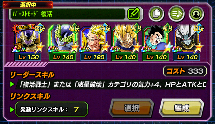 リーダーは、「復活戦士」カテゴリの気力+4、HPとATKとDEF170%UPのリーダースキルを保持した【帝王の新たな力】ゴールデンフリーザとしました。