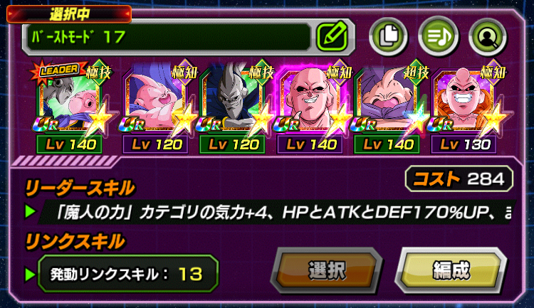 リーダーは、「魔人の力」カテゴリの 気力+4、HPとATKとDEF170%UPのリーダースキルを保持した【善と悪の分裂】魔人ブウ(善)/魔人ブウ(純粋悪)としました。